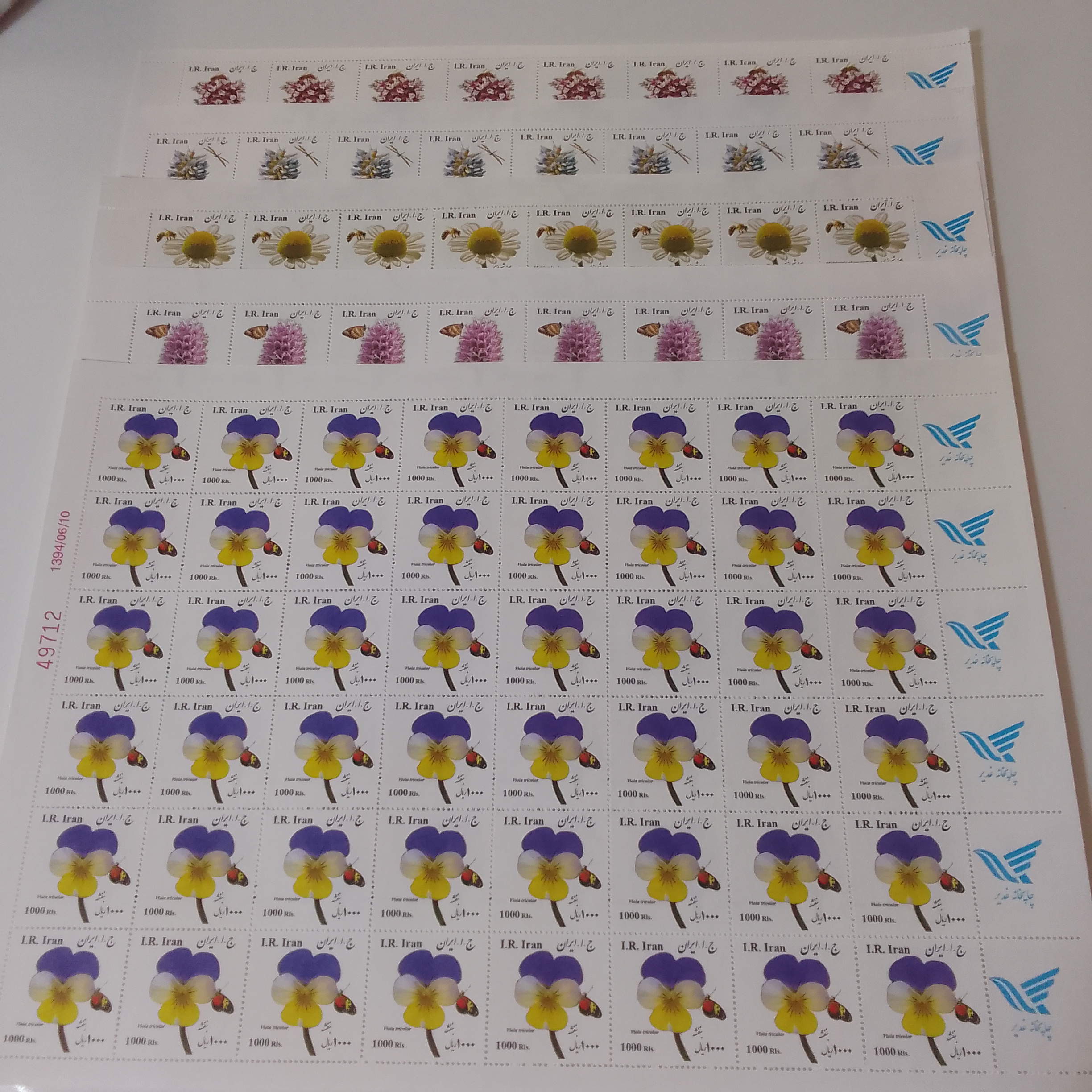 سری جاری گلهای سایز بزرگ چاپ چاپخانه غدیر پست در ۵ ورق شامل ارقام ، ۱۰۰۰،۲۰۰۰،۵،۰۰۰،۱۰۰۰۰۰، ۵۰۰ ریالی از سری گلها و گیاهان دارویی